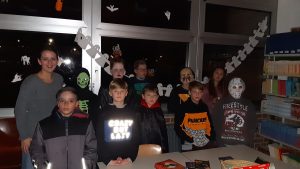 … dann steht wohl wieder die alljährliche Halloween-Lesenacht der RS+ Am Schlossberg Westerburg an. Gemeinsam mit dem Bücherei-Team haben die Lehrerinnen Susanne Jung-Kloft und Elena Bierenfeld im Vorfeld die Bücherei dekoriert und gespenstische Bücher zum Vorlesen ausgewählt. Bei leckerer Kürbissuppe, die die HuS-Gruppe mit Frau Wayand für die abendliche Leserunde zubereitet hatte, machten sich die jungen Leser bei Kerzenschein und Dämmerlicht auf die Suche nach Monstern, Vampiren und Zombies in der Literatur.