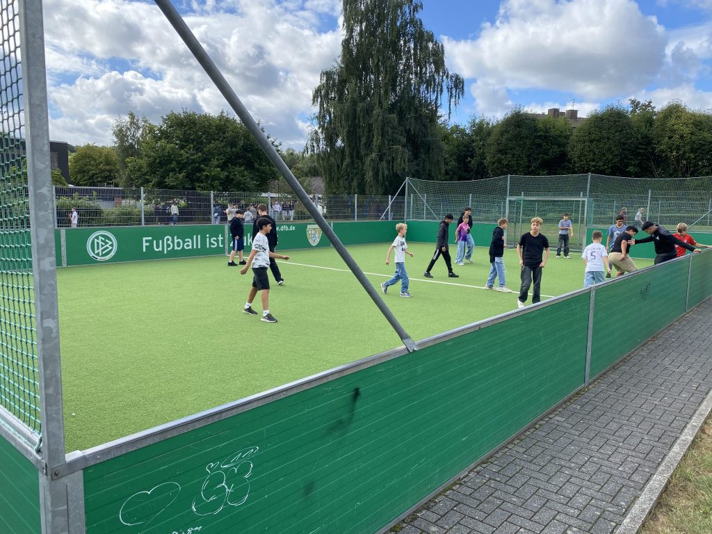 Kurz vor den Sommerferien freuten sich die Schüler und Schülerinnen der Realschule plus am Schlossberg Westerburg über die Sanierung des beliebten und vielgenutzten DFB-Kleinspielfeldes auf dem Schulhof. Das seit 2006 zum Schulbild gehörende Fußballfeld, welches anlässlich der WM in Deutschland auf dem Gelände der Schule errichtet wurde, wurde generalüberholt. Der komplette Bodenbelag wurde in Rekordzeit erneuert und die Tornetze und Bandensysteme ausgetauscht. Die Ausgaben im Rahmen von 27.000 € waren nicht nur in den Augen der Schülerschaft eine wertvolle Investition. Da Bewegung auf dem Pausengelände zum Leitbild der Schule gehört, freuten sich auch die Lehrerinnen und Lehrer und die Schulleitung der Schule. Der schönste Kommentar zur Sanierung: „Man spielt jetzt Fußball wie auf Wolken!“. Wir als Schule sagen herzlichen Dank an den Schulträger der Verbandsgemeinde Westerburg!